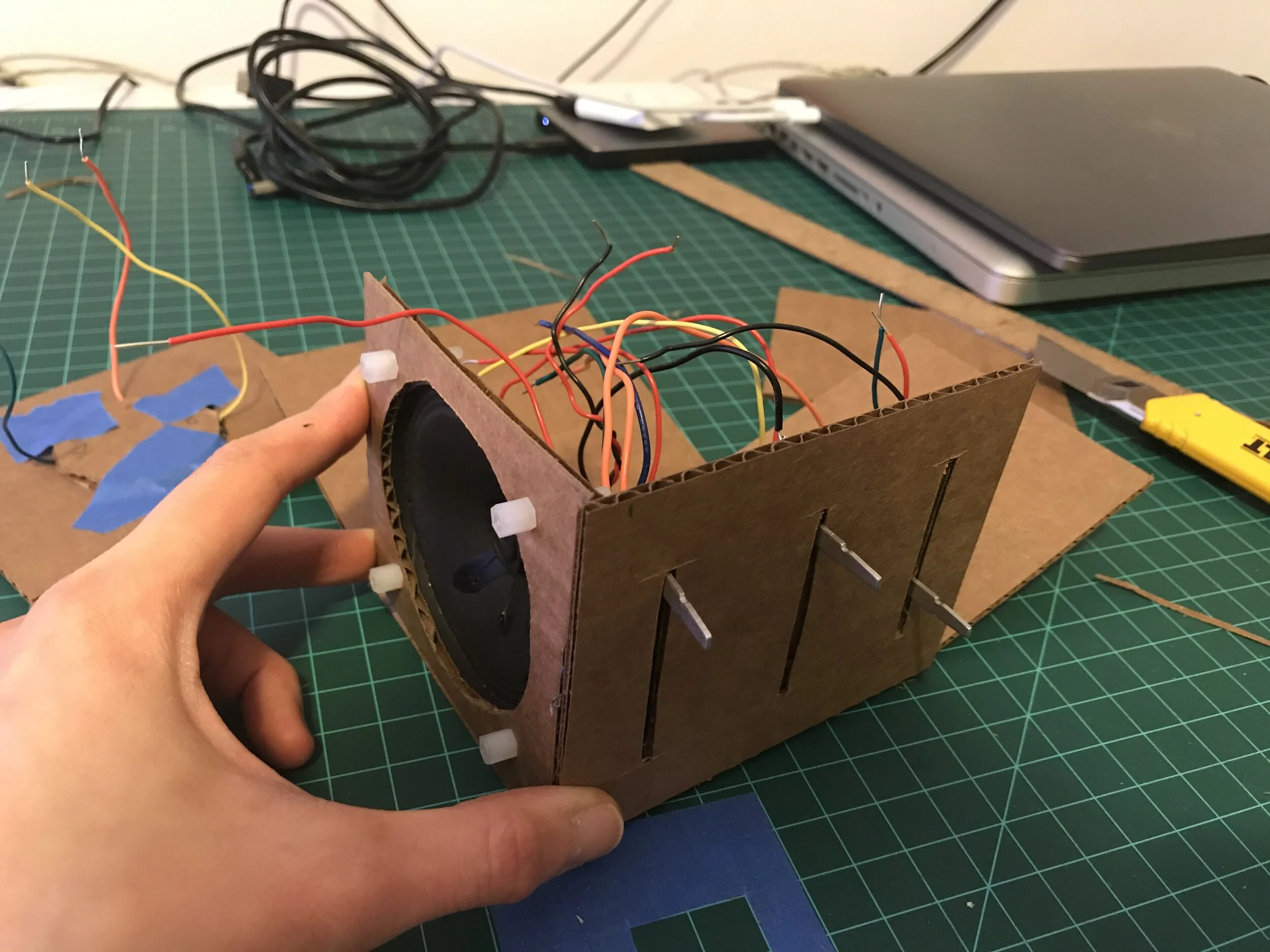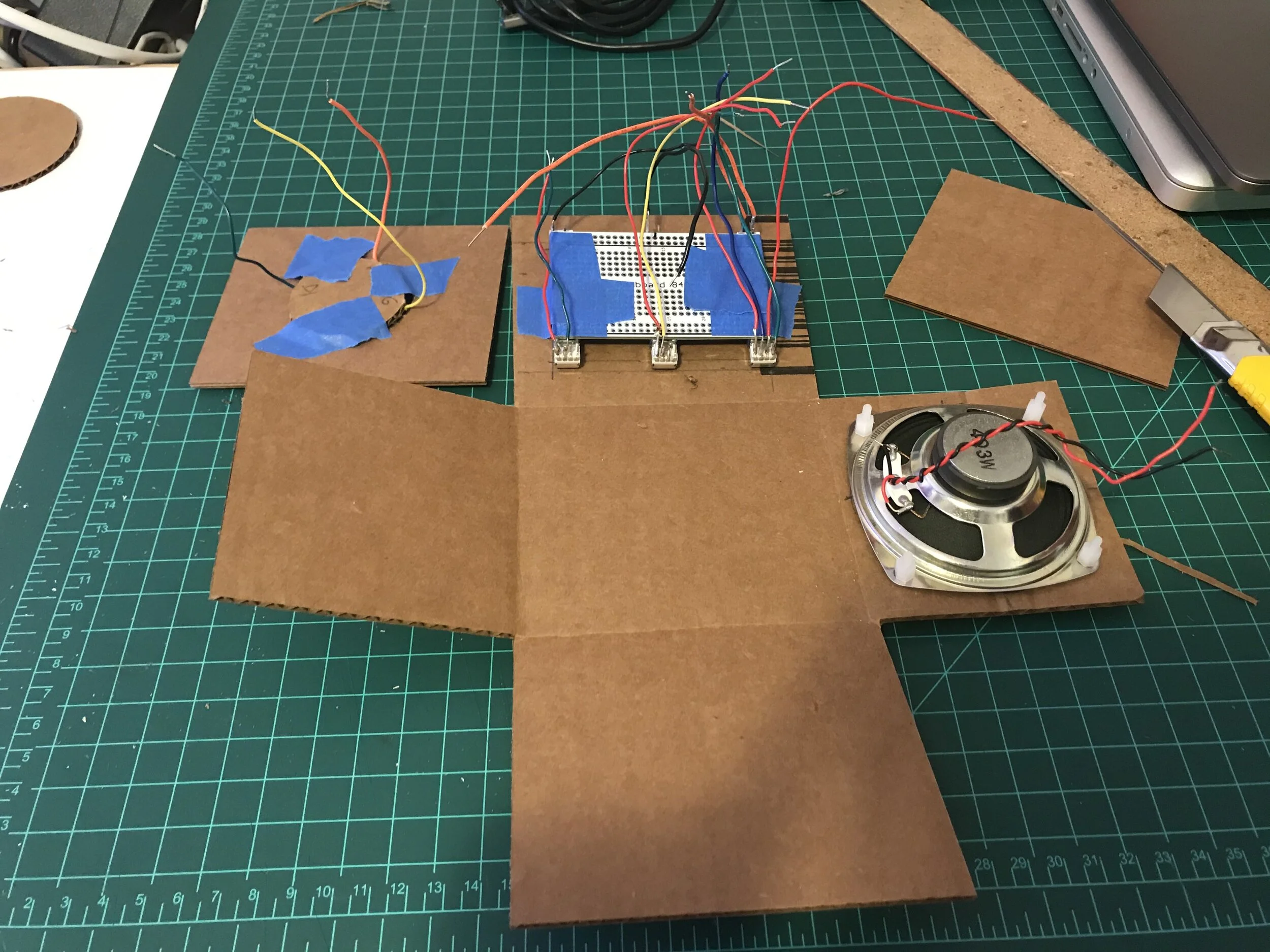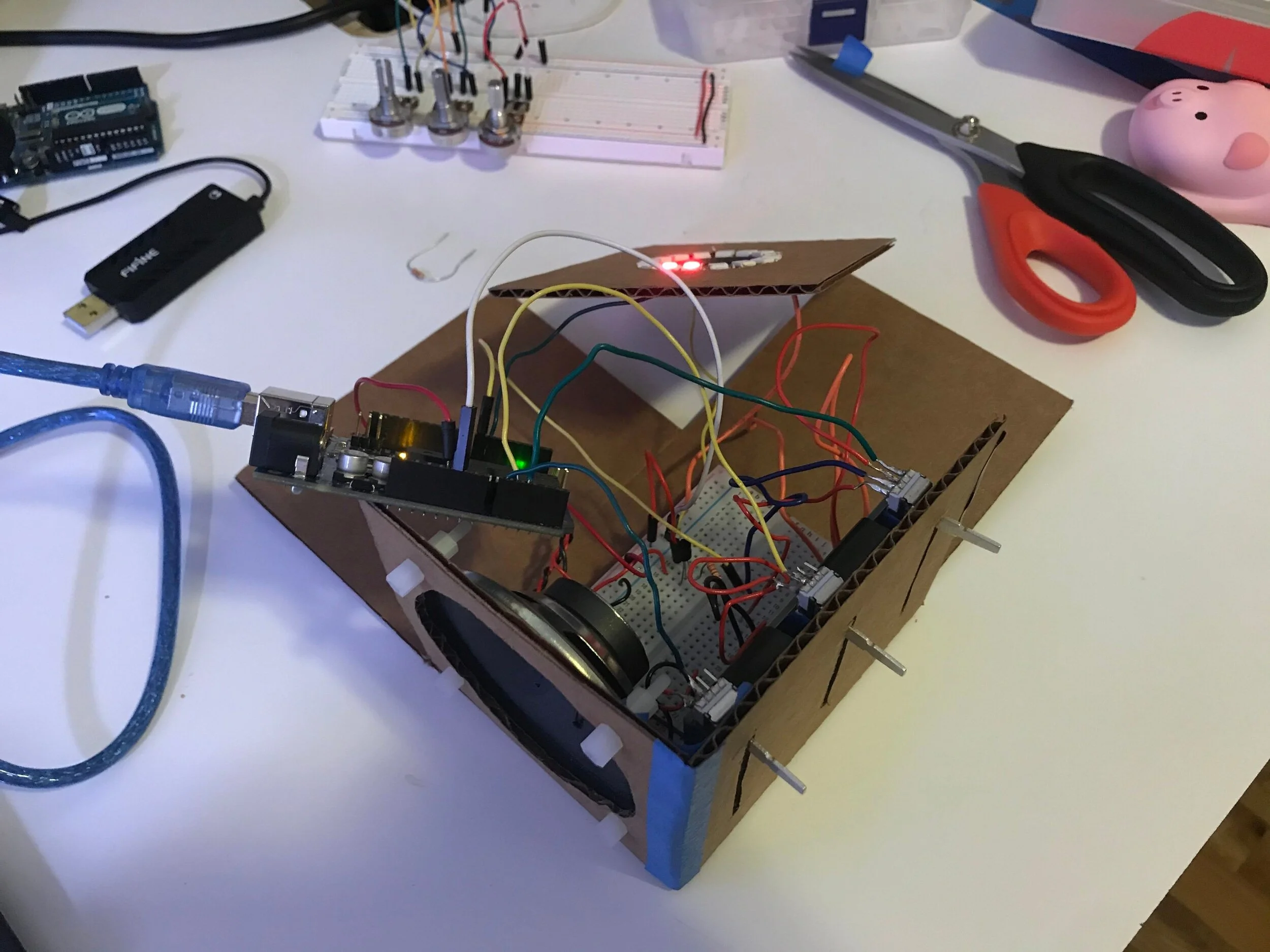This is my musical light box prototype. I got the hardware parts and configuration to work the way I had envisioned without the PCB and surface mount components of course. For the fabrication I was hoping to use a laser cutter and a more sturdy material but given the remote learning situation I had to resort to cardboard and a knife. I’m also missing slider knobs.