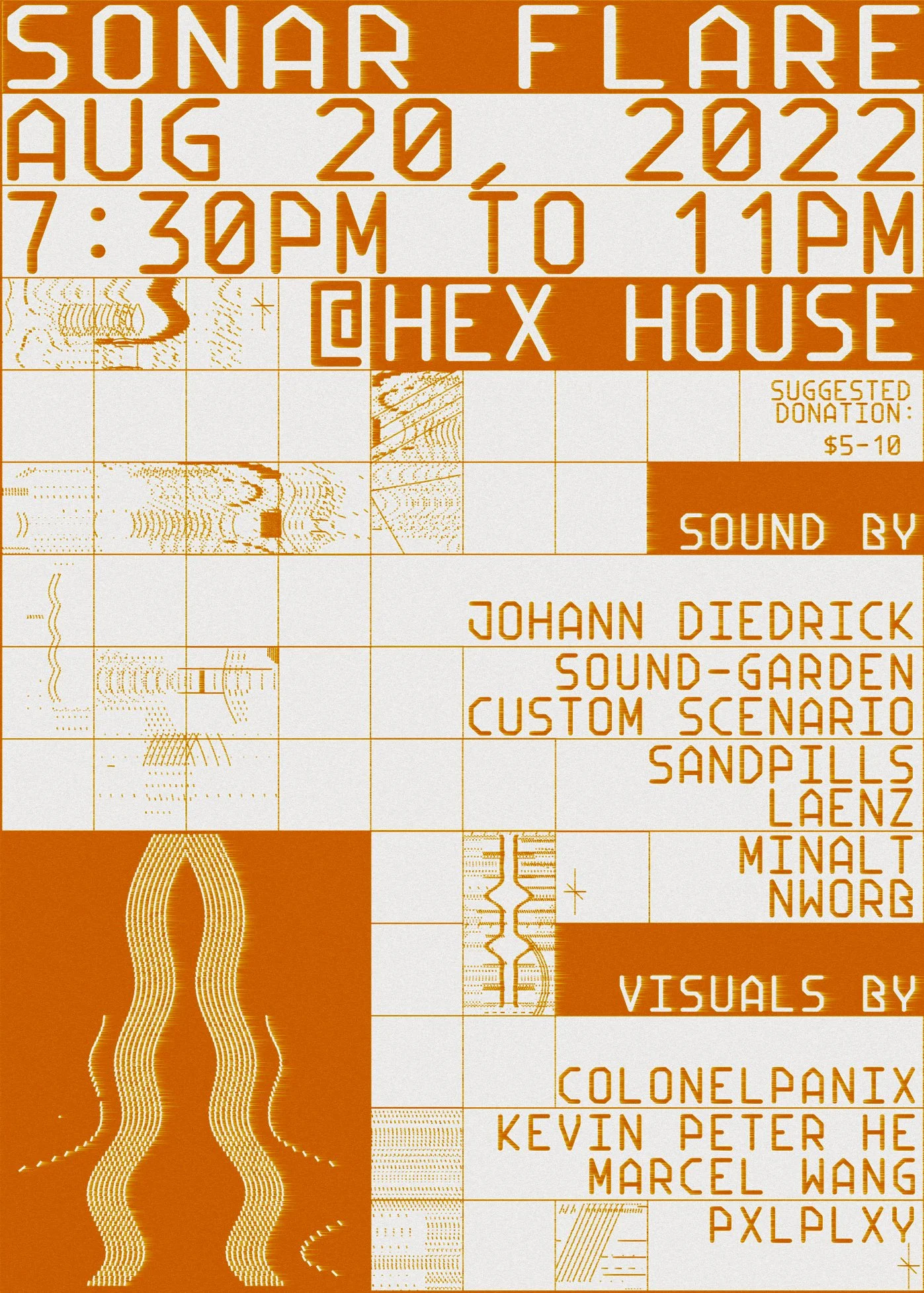 Electromagnetic activity in the visual spectrum will also be present in the night accompanying each sonic flare. Visuals will be presented by: